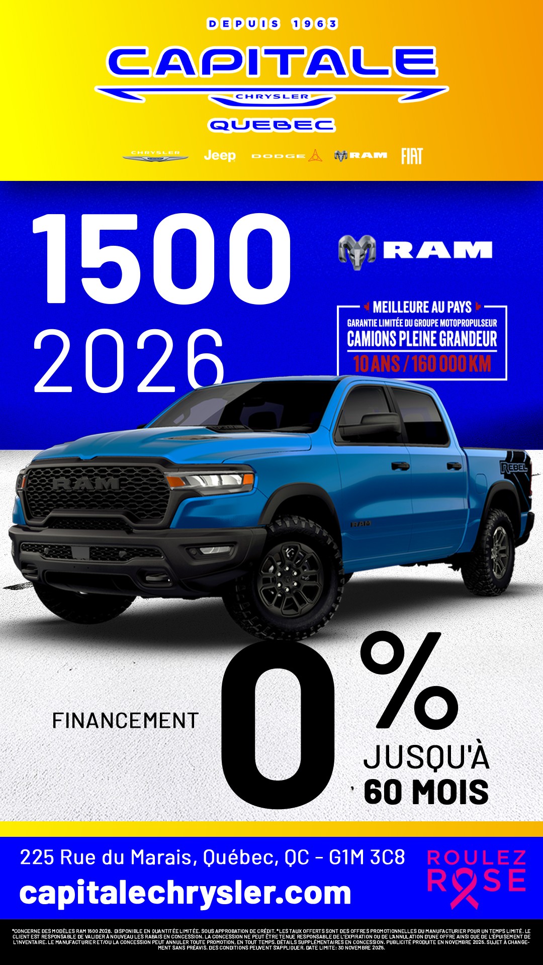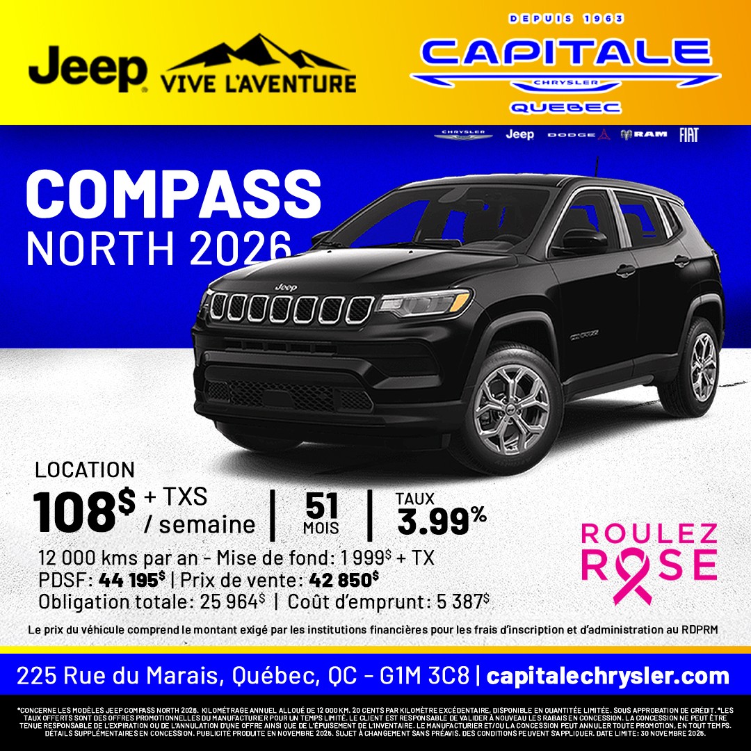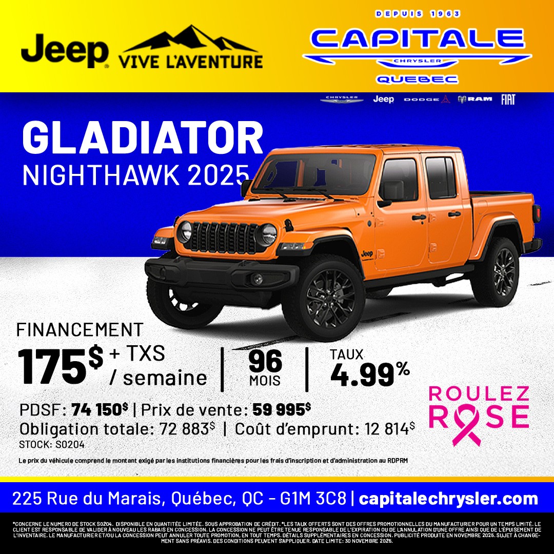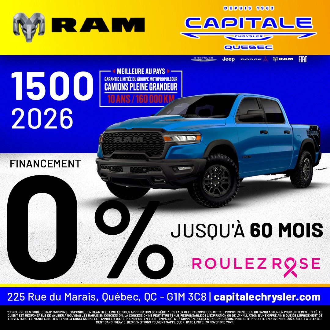 À la recherche de promotions incontournables sur les véhicules Chrysler, Jeep, RAM, Dodge et Fiat? Capitale Chrysler est le lieu à ne pas manquer! Nous sommes fiers de vous offrir des réductions exceptionnelles sur notre gamme Chrysler, Jeep, RAM, Dodge et Fiat. Que vous convoitiez une berline raffinée, un puissant 4x4, un SUV spacieux ou un utilitaire robuste, nos offres sont pensées pour un rapport qualité-prix sans équivalent. Profitez de nos promotions actuelles pour réaliser d'importantes économies sur l'achat d'un véhicule Chrysler, Jeep, RAM, Dodge et Fiat neuf ou d'occasion. Nos rabais, taux de financement compétitifs et incitatifs exclusifs rendent l'acquisition de votre Chrysler, Jeep, RAM, Dodge et Fiat encore plus séduisante. Notre équipe est là pour vous aider à choisir parmi toutes les promotions, afin que vous fassiez le meilleur choix pour votre investissement automobile. Les véhicules Chrysler, Jeep, RAM, Dodge et Fiat offrent une large gamme répondant à toutes vos attentes en termes de performance, technologie, sécurité et style. Saisissez l'occasion d'acquérir un véhicule de qualité supérieure tout en bénéficiant de nos offres exclusives. Visitez Capitale Chrysler dès aujourd'hui pour découvrir nos promotions actuelles et essayer ces véhicules exceptionnels. Ne manquez pas cette chance d'allier style, performance et fiabilité à des prix compétitifs. Chez Capitale Chrysler, la meilleure offre pour votre prochain véhicule Chrysler, Jeep, RAM, Dodge et Fiat vous attend. Venez chez Capitale Chrysler et économisez grandement sur votre prochain achat automobile!
