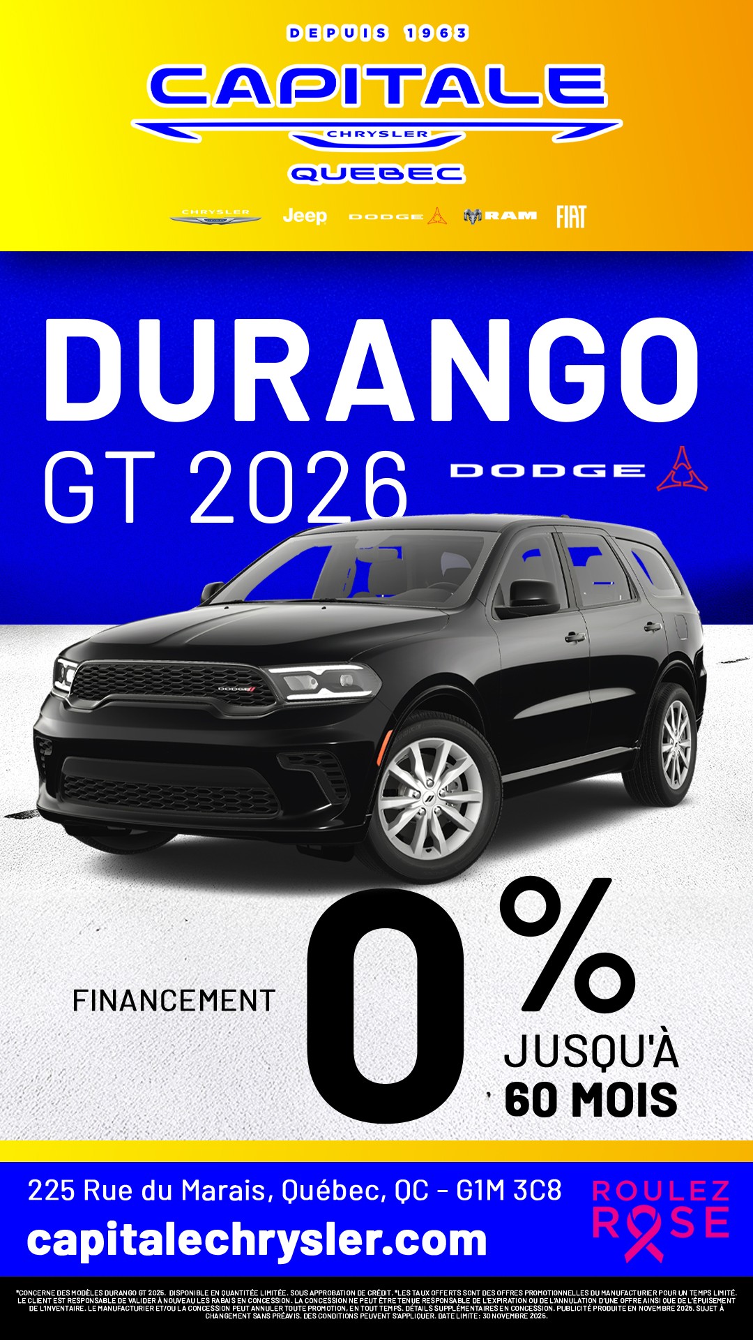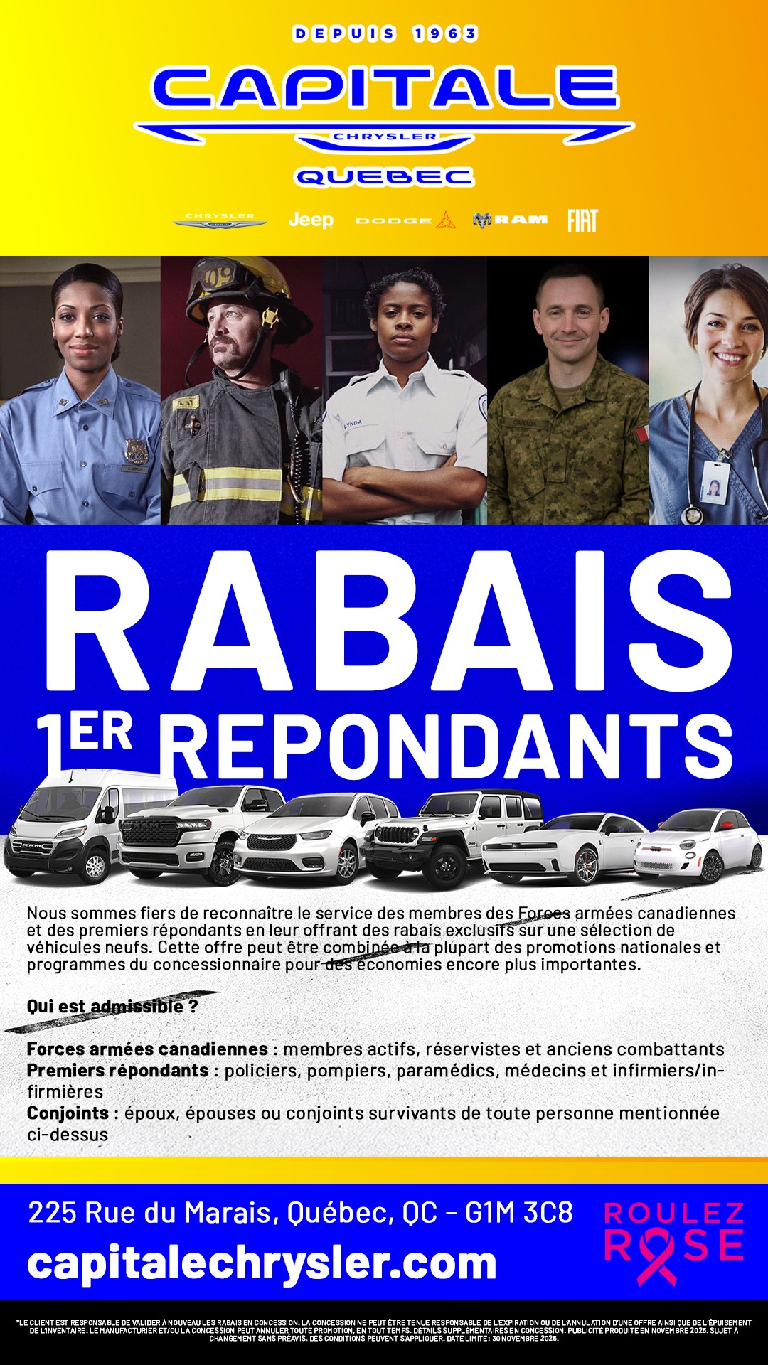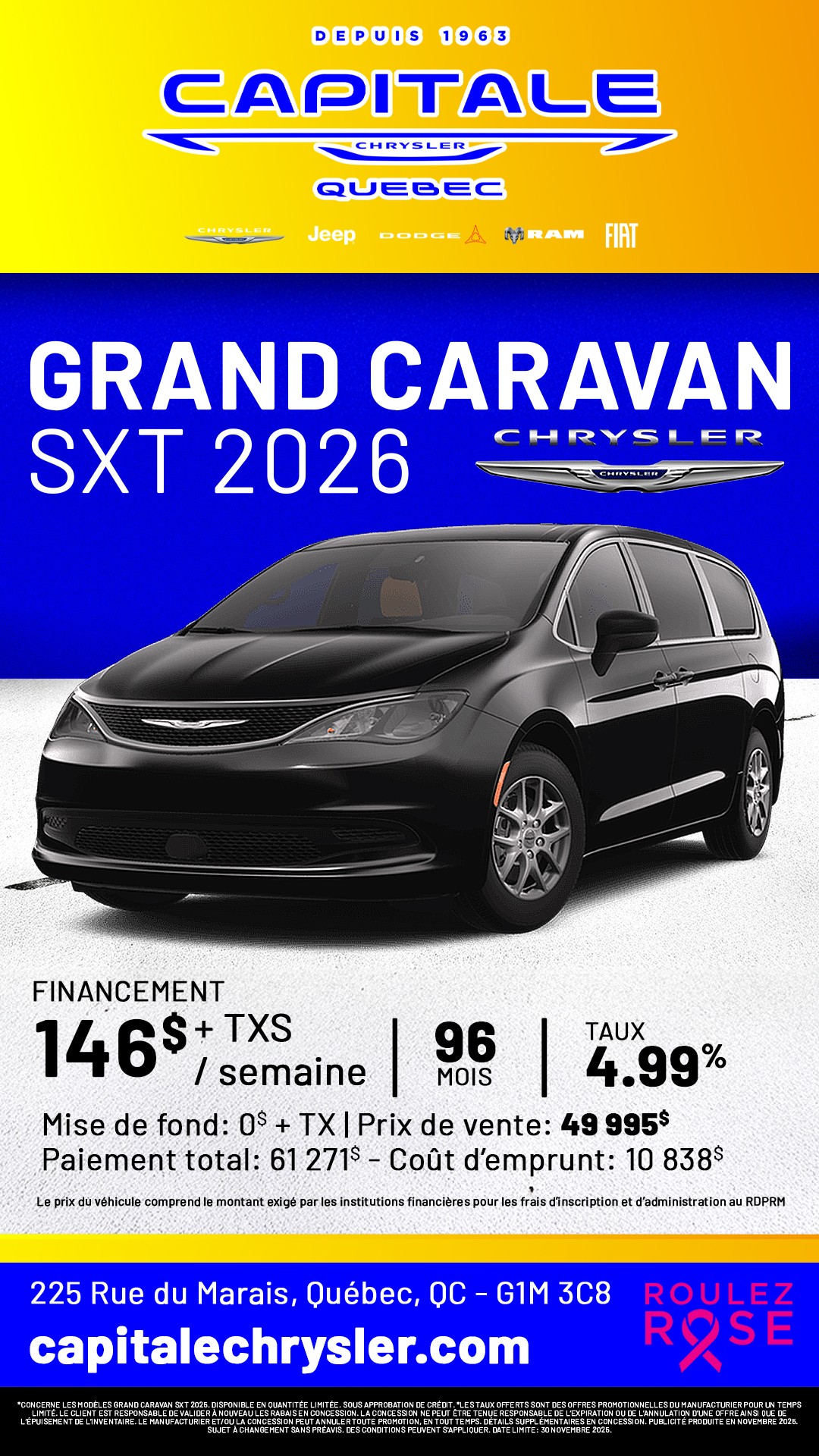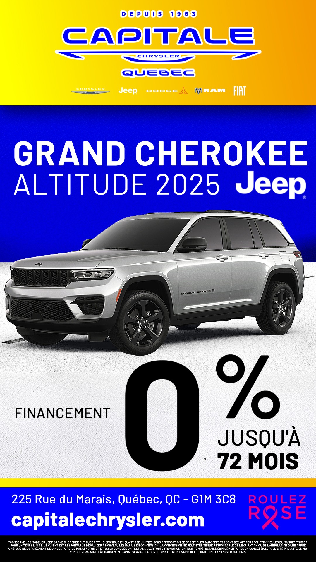 À la recherche de promotions incontournables sur les véhicules Chrysler, Jeep, RAM, Dodge et Fiat? Capitale Chrysler est le lieu à ne pas manquer! Nous sommes fiers de vous offrir des réductions exceptionnelles sur notre gamme Chrysler, Jeep, RAM, Dodge et Fiat. Que vous convoitiez une berline raffinée, un puissant 4x4, un SUV spacieux ou un utilitaire robuste, nos offres sont pensées pour un rapport qualité-prix sans équivalent. Profitez de nos promotions actuelles pour réaliser d'importantes économies sur l'achat d'un véhicule Chrysler, Jeep, RAM, Dodge et Fiat neuf ou d'occasion. Nos rabais, taux de financement compétitifs et incitatifs exclusifs rendent l'acquisition de votre Chrysler, Jeep, RAM, Dodge et Fiat encore plus séduisante. Notre équipe est là pour vous aider à choisir parmi toutes les promotions, afin que vous fassiez le meilleur choix pour votre investissement automobile. Les véhicules Chrysler, Jeep, RAM, Dodge et Fiat offrent une large gamme répondant à toutes vos attentes en termes de performance, technologie, sécurité et style. Saisissez l'occasion d'acquérir un véhicule de qualité supérieure tout en bénéficiant de nos offres exclusives. Visitez Capitale Chrysler dès aujourd'hui pour découvrir nos promotions actuelles et essayer ces véhicules exceptionnels. Ne manquez pas cette chance d'allier style, performance et fiabilité à des prix compétitifs. Chez Capitale Chrysler, la meilleure offre pour votre prochain véhicule Chrysler, Jeep, RAM, Dodge et Fiat vous attend. Venez chez Capitale Chrysler et économisez grandement sur votre prochain achat automobile!