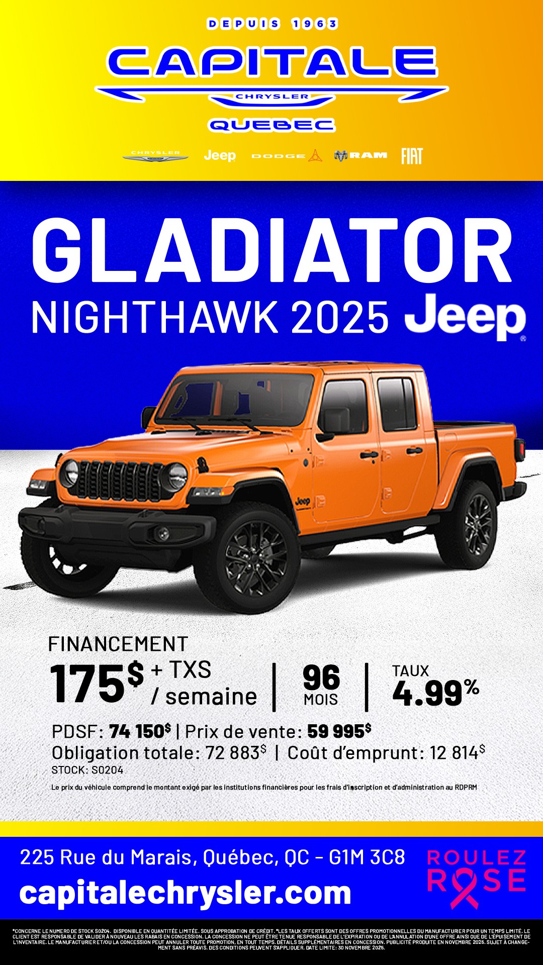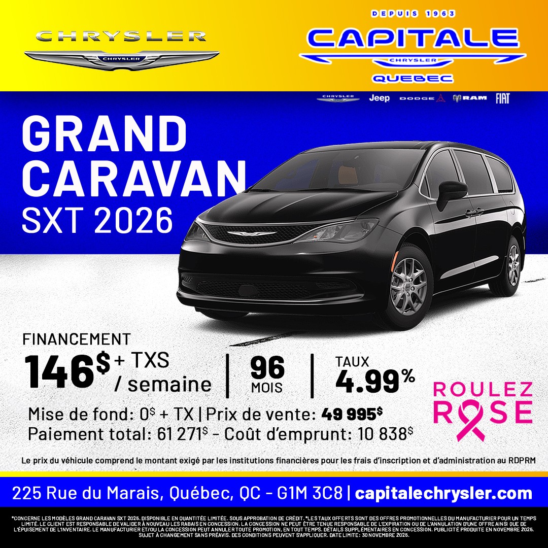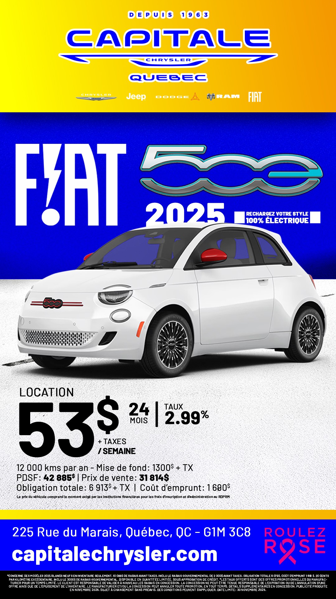 À la recherche de promotions incontournables sur les véhicules Chrysler, Jeep, RAM, Dodge et Fiat? Capitale Chrysler est le lieu à ne pas manquer! Nous sommes fiers de vous offrir des réductions exceptionnelles sur notre gamme Chrysler, Jeep, RAM, Dodge et Fiat. Que vous convoitiez une berline raffinée, un puissant 4x4, un SUV spacieux ou un utilitaire robuste, nos offres sont pensées pour un rapport qualité-prix sans équivalent. Profitez de nos promotions actuelles pour réaliser d'importantes économies sur l'achat d'un véhicule Chrysler, Jeep, RAM, Dodge et Fiat neuf ou d'occasion. Nos rabais, taux de financement compétitifs et incitatifs exclusifs rendent l'acquisition de votre Chrysler, Jeep, RAM, Dodge et Fiat encore plus séduisante. Notre équipe est là pour vous aider à choisir parmi toutes les promotions, afin que vous fassiez le meilleur choix pour votre investissement automobile. Les véhicules Chrysler, Jeep, RAM, Dodge et Fiat offrent une large gamme répondant à toutes vos attentes en termes de performance, technologie, sécurité et style. Saisissez l'occasion d'acquérir un véhicule de qualité supérieure tout en bénéficiant de nos offres exclusives. Visitez Capitale Chrysler dès aujourd'hui pour découvrir nos promotions actuelles et essayer ces véhicules exceptionnels. Ne manquez pas cette chance d'allier style, performance et fiabilité à des prix compétitifs. Chez Capitale Chrysler, la meilleure offre pour votre prochain véhicule Chrysler, Jeep, RAM, Dodge et Fiat vous attend. Venez chez Capitale Chrysler et économisez grandement sur votre prochain achat automobile!