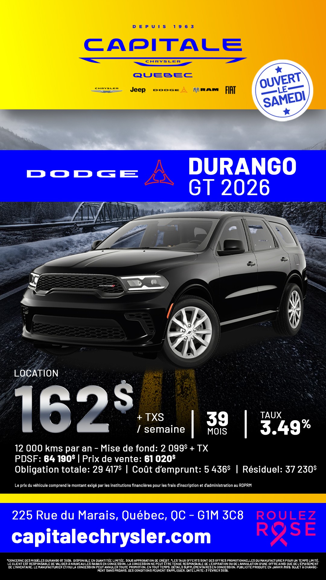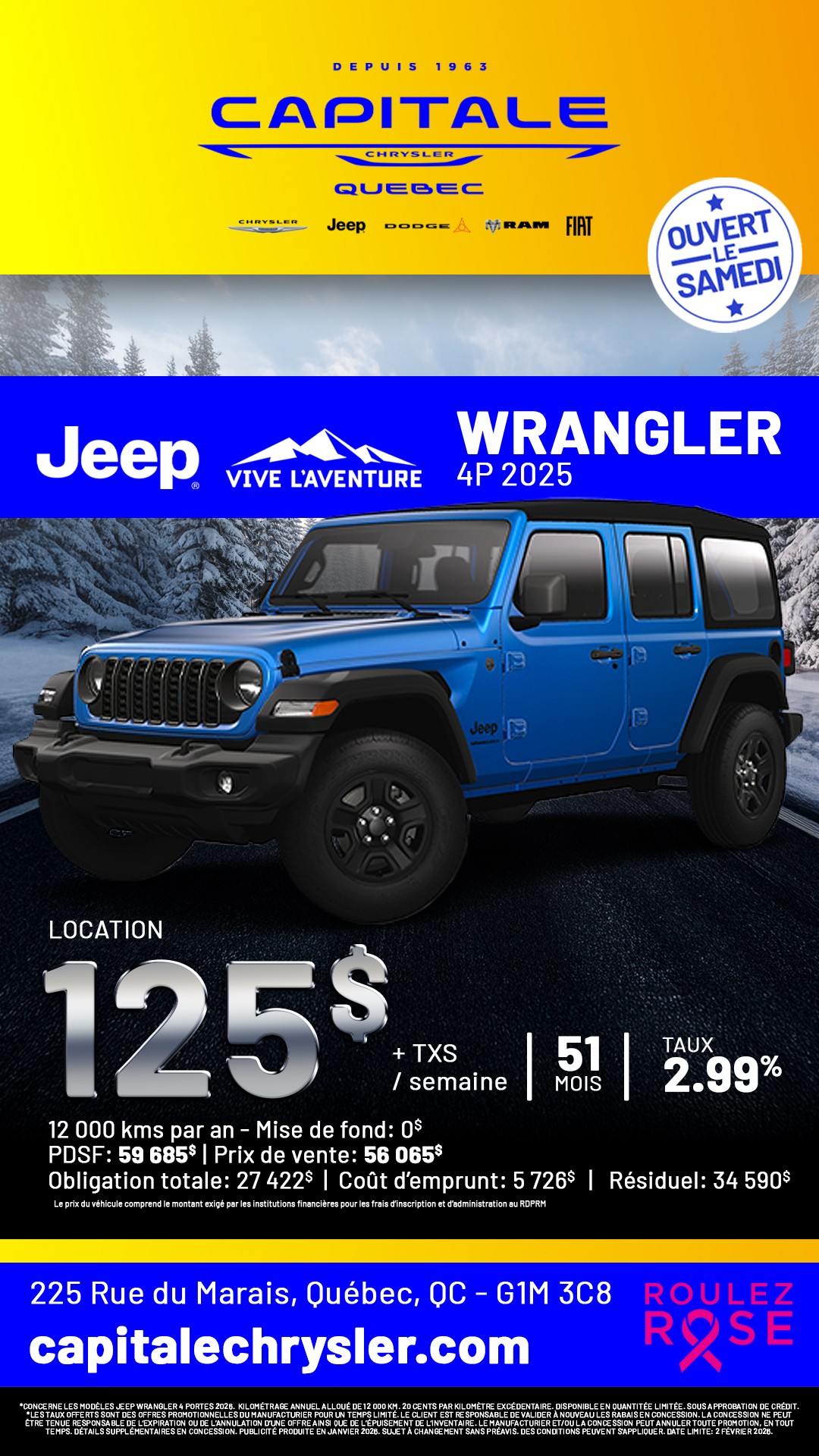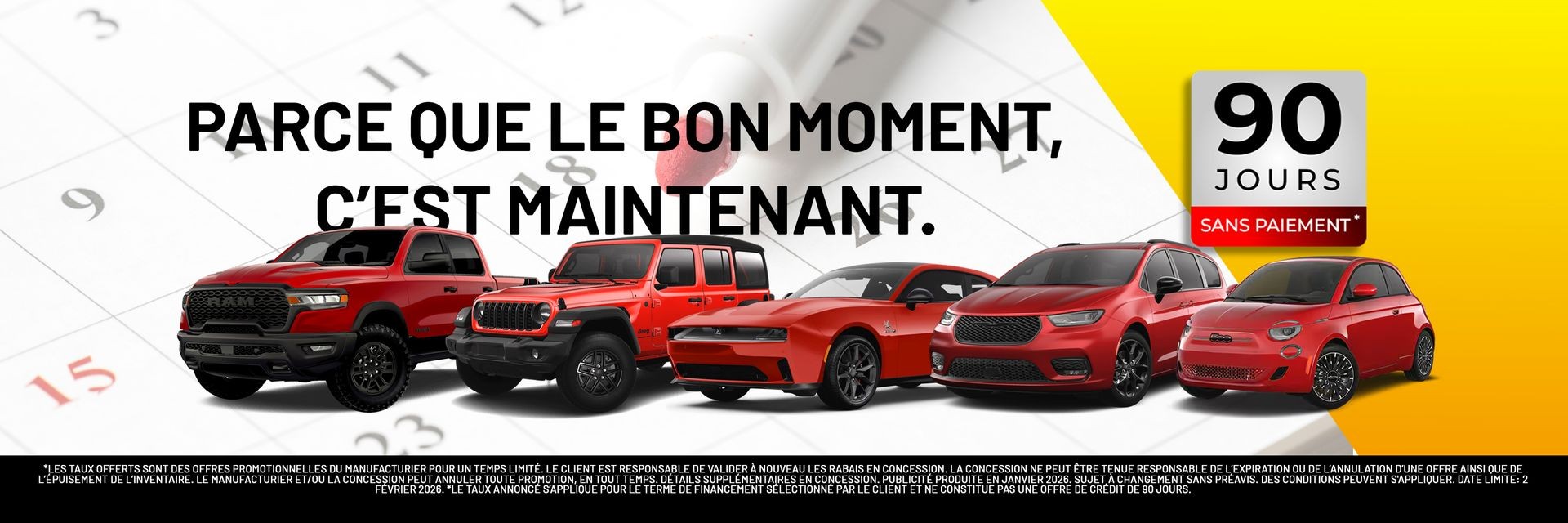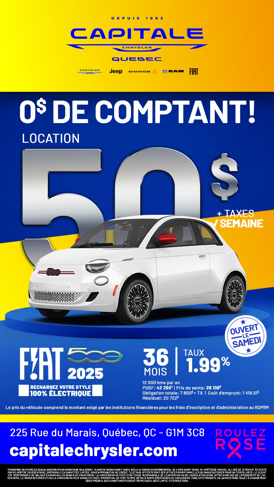 Looking for unbeatable deals on Chrysler, Jeep, RAM, Dodge and Fiat vehicles? Look no further than Capitale Chrysler! We're proud to offer outstanding promotions on our entire Chrysler, Jeep, RAM, Dodge and Fiat range. Whether you're interested in an elegant sedan, a powerful 4x4 truck, a spacious SUV, or a robust utility vehicle, our special offers are designed to provide unmatched value for money. Our current promotions let you save big on purchasing a new or used Chrysler, Jeep, RAM, Dodge and Fiat vehicle. Take advantage of exceptional discounts, favorable financing rates, and unique incentives that make owning your Chrysler, Jeep, RAM, Dodge and Fiat even more attractive. Our dedicated team is here to guide you through all available promotions, ensuring you make the most of your automotive investment. Whether you're a fan of performance, technology, safety, or style, Chrysler, Jeep, RAM, Dodge and Fiat vehicles offer a diverse range of models to meet all your expectations. Don't miss the opportunity to own a superior quality vehicle while enjoying exceptional offers. Visit us today at Capitale Chrysler to explore our current promotions and test drive these amazing vehicles. Don't miss this chance to drive with style, performance, and reliability, all at advantageous prices. At Capitale Chrysler, you're sure to find the best deal on your next Chrysler, Jeep, RAM, Dodge and Fiat vehicle. Come to Capitale Chrysler and save big on your automotive purchase!